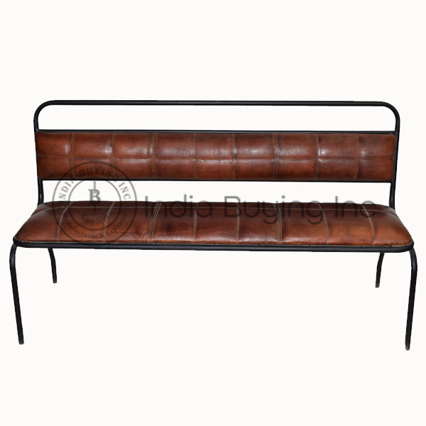 Siège et dossier en cuir véritable vintage industriel Banc de cadre en fer pour restaurant d'intérieur