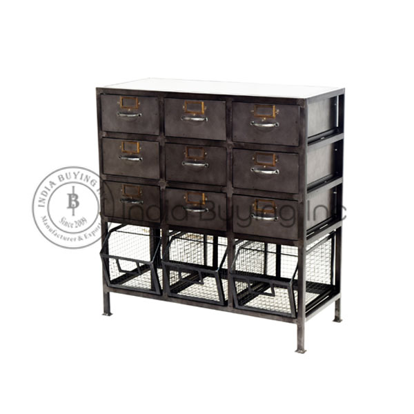 wooden iron industrial design sliding glass door 3 drawer storage cum display cabinet