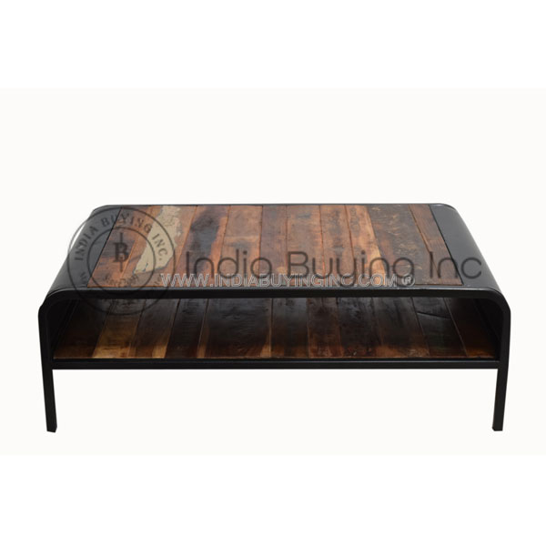 iron base half round iron sheet recycled painted wood one shelf storage coffee cum center table