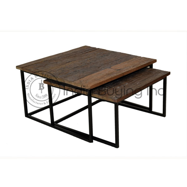 Industrial design wrought iron base square center set of two coffee table top made of slipper wood and metal legs.
