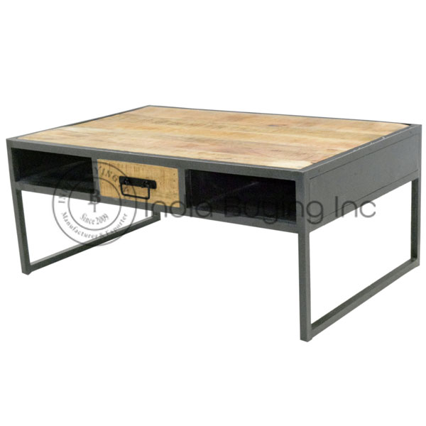 vintage industrial style iron frame mesh self mango rough wood top square center table .