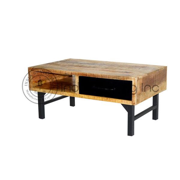 vintage industrial style iron frame wooden self mango rough wood top square center table .