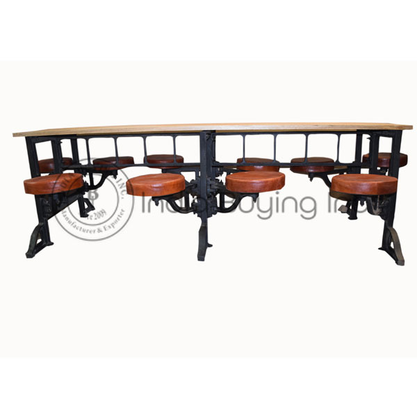 Table de cantine à siège pivotant industriel vintage en fonte avec dessus et siège en bois grande taille