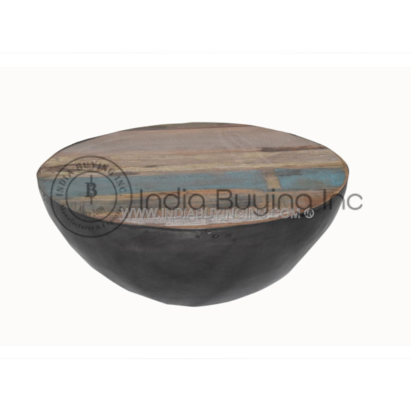 This round shape coffee table is made from iron sheet base and features a smooth wide recycledwood top that can be used for serving and various decorative purposes. This short heighted coffee table has a narrow flat base that provides it a good stability on the ground.