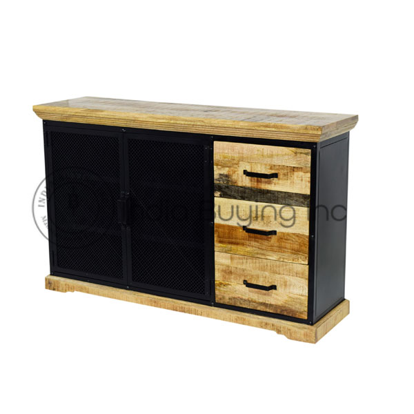 wooden iron industrial design sliding glass door 3 drawer storage cum display cabinet