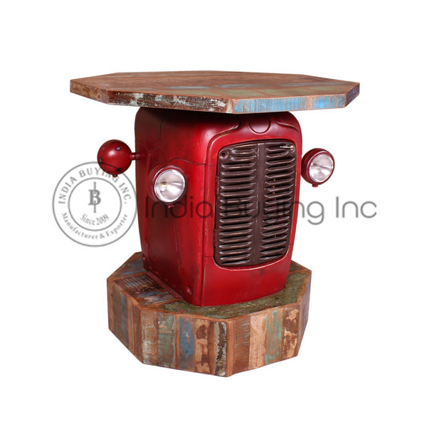 Vintage Indiase tractor uitgerust met teruggewonnen kleurrijke schroothouten basis en bovenkant. Unieke tafel voor café, restaurant en thuis.