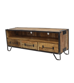 Industrial rough mango wood three drawer TV cabinet cum storage with iron legs .