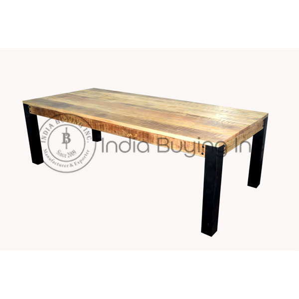 Industrial design wrought iron base square center coffee table made of mango wood and metal legs.