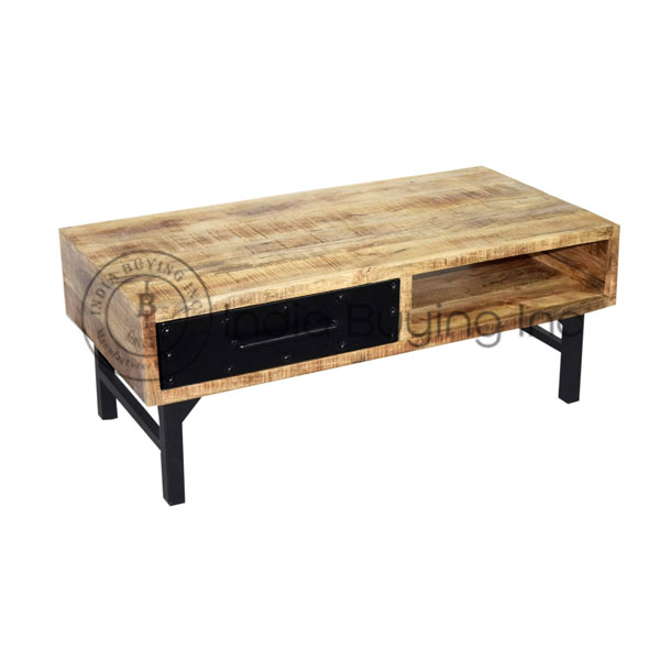 industrial design iron base mango rough wood tv table cum side table with 2 drawer storage