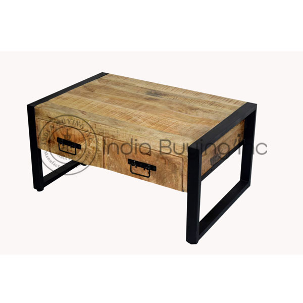 vintage industrial style iron frame wooden self mango rough wood top square center table .