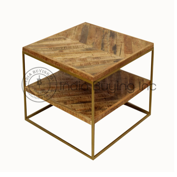 vintage industrial style iron frame wooden self mango rough wood top square center table .