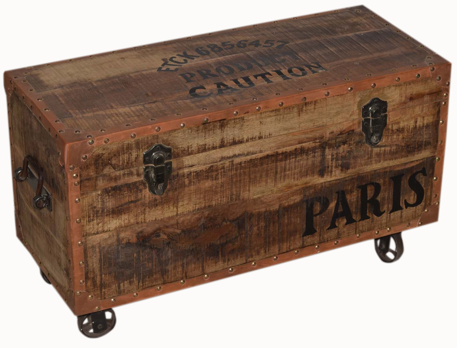 Vintage industriële gietijzeren wielen lederen verschuifbare opbergdoos met vintage graffiti.