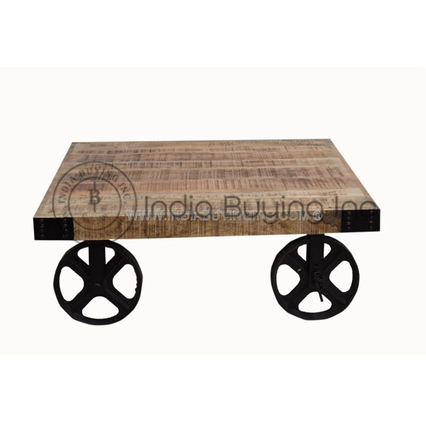 industrial design cast iron base cart coffee table cum center table , top made of rough mango wood with natural antique finish , suitable for living room hotel and restaurant .