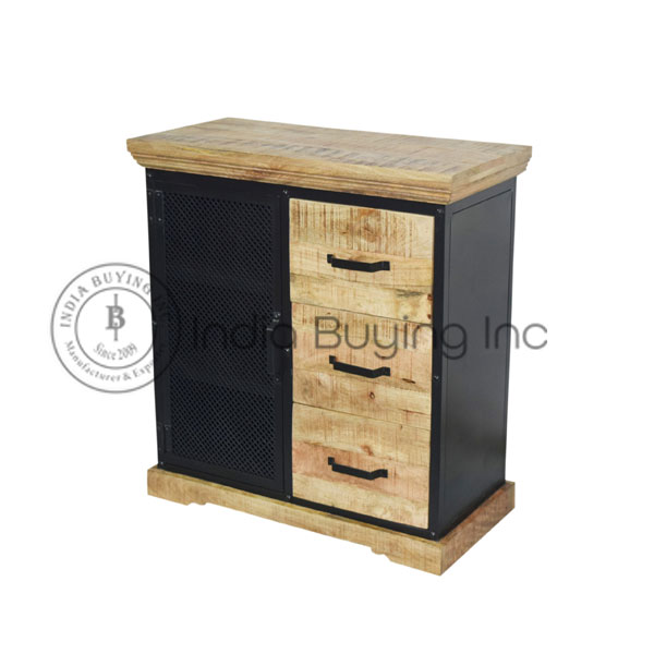 wooden iron industrial design sliding glass door 3 drawer storage cum display cabinet