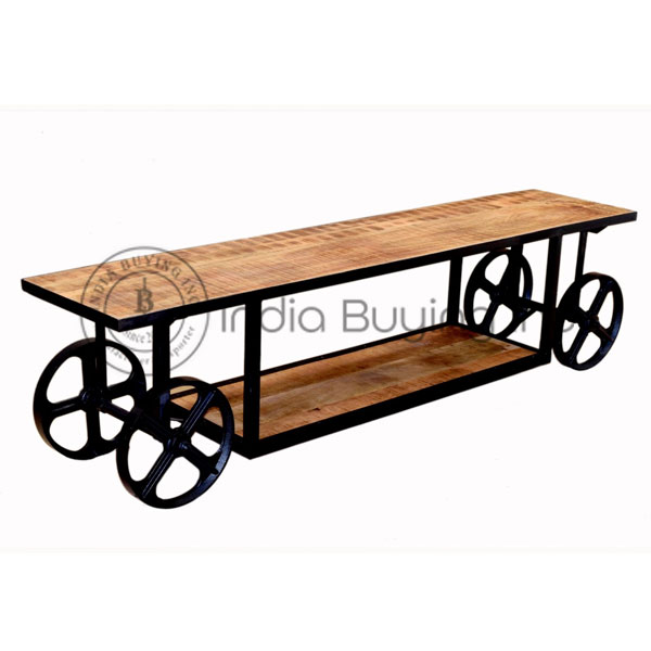 Industrial style media consolde table with mango wood and top iron frame with caster .