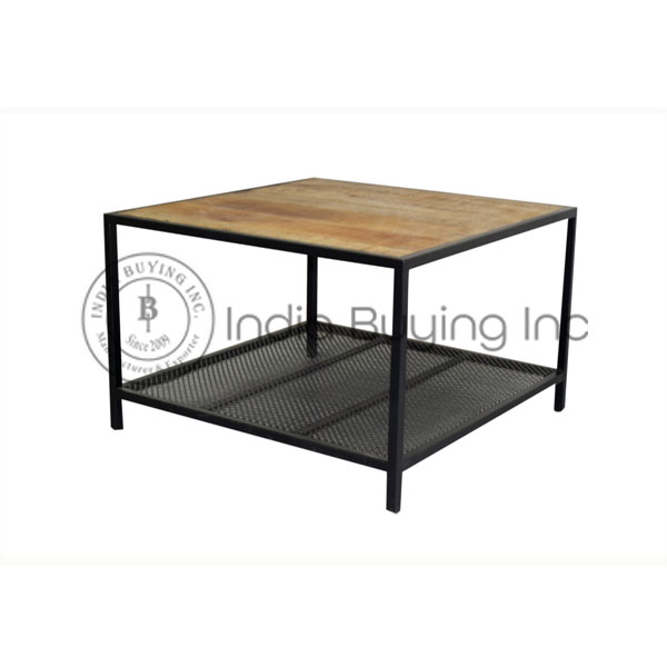 vintage industrial style iron frame mesh self mango rough wood top square center table .