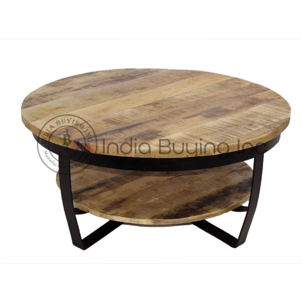 Industrial design wrought iron base round center coffee table made of mango wooden and metal legs.
