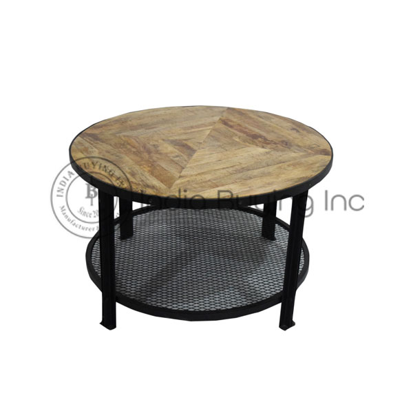 vintage industrial style iron frame mesh self mango rough wood top round center table .
